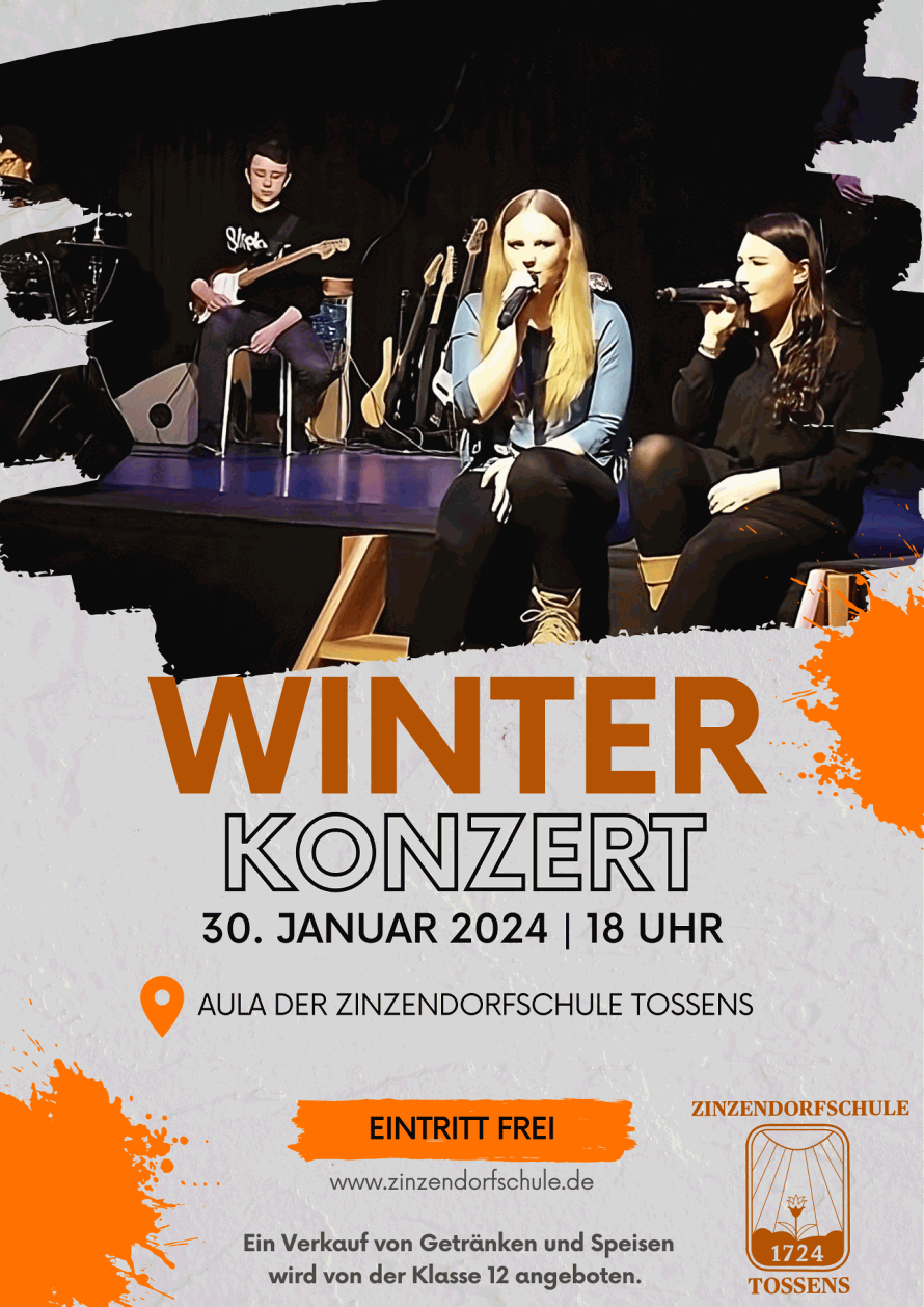 Die Zinzendorfschule Tossens lädt herzlich zum diesjährigen Winterkonzert am 30. Januar 2024 um 18 Uhr in die Aula der Schule (Auf dem Int 7, 26969 Butjadingen-Tossens) ein.