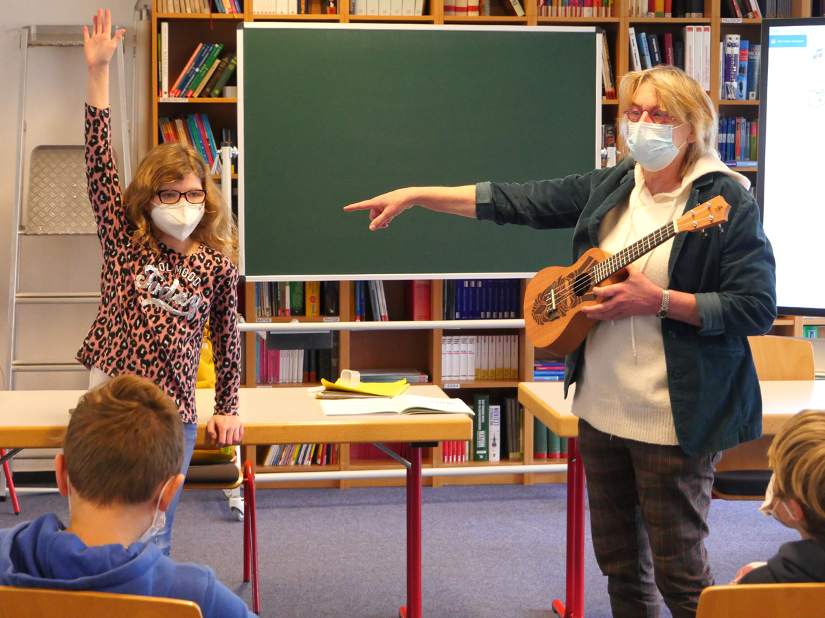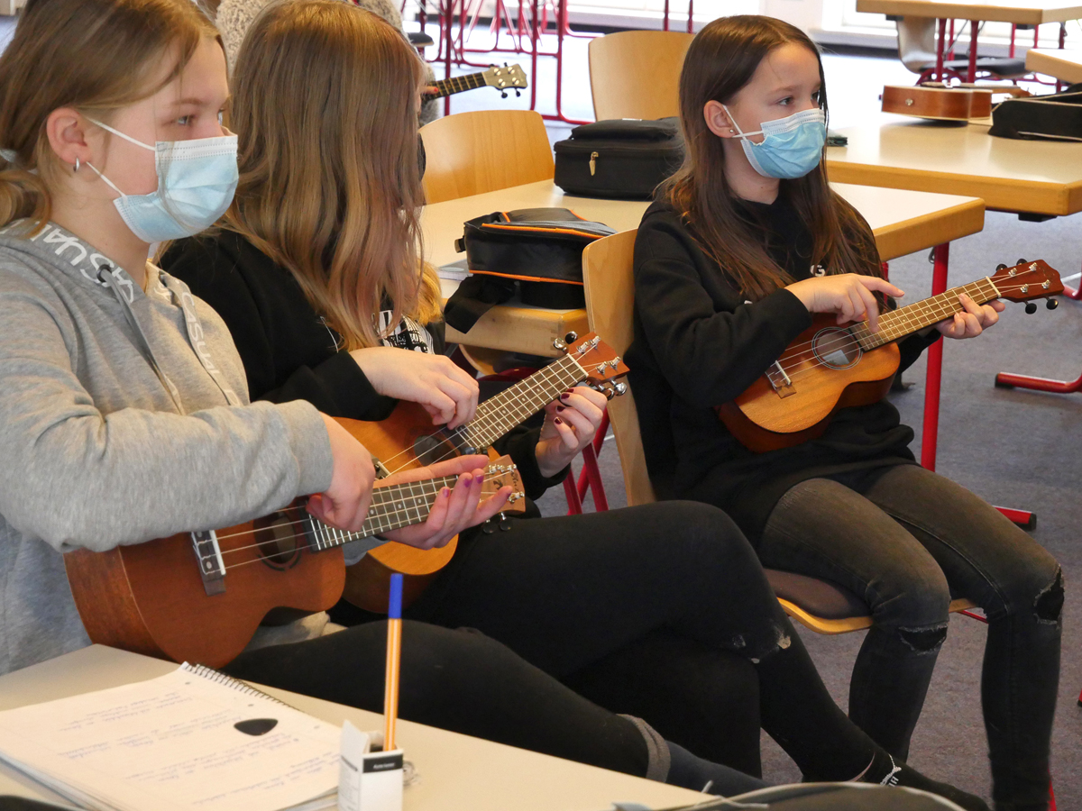 Emily gibt den Takt vor, sie ist heute das „Schlagzeug“. Die anderen 16 Schülerinnen und Schüler der Klasse 5b steigen mit ihren Ukulelen ein. Seit Beginn des Schuljahres lernen sie im wöchentlichen Musikunterricht bei ihrer Lehrerin Ute Extra die Grundlagen des Ukulelespiels. Die Kinder sind mit Konzentration und großer Freude bei der Sache.