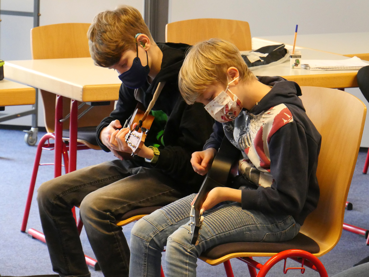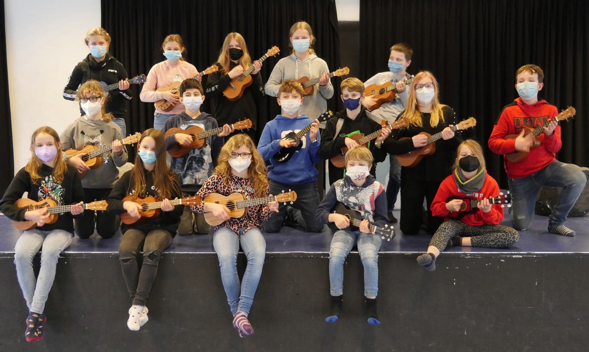 Die Idee zu diesem Instrumentalunterricht stammt von Musiklehrer Wilhelm Magnus, der gemeinsam mit seiner Kollegin nach Möglichkeiten suchte, das fehlende gemeinsame Singen während der Coronazeit sinnvoll auszugleichen. Da bot sich die Ukulele an. Die „kleine Gitarre“ ist relativ einfach zu erlernen, preiswert in der Anschaffung und - es macht einfach Spaß darauf zu spielen. Die Schülerinnen und Schüler der Klassen 5-7 haben Ukulelen angeschafft und üben fleißig. Wir sind gespannt, wann wir den ersten Auftritt ankündigen dürfen.